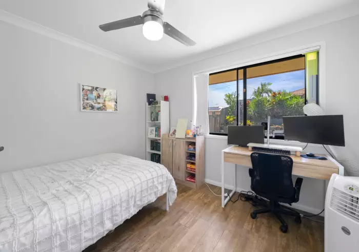 • Four well-sized bedrooms, including a master suite with split system A/C, ensuite, walk-in robe, vinyl flooring and block-out blinds. All remaining bedrooms are accompanied with ceiling fans, block-out blinds, vinyl flooring and built-in robes, serviced by a main bathroom with shower, stone vanity and bathtub.