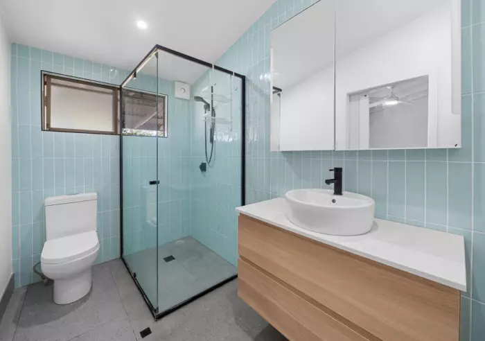 • Three spacious bedrooms including a master suite with ensuite, built-in robe, block-out blinds and ceiling fan. All remaining bedrooms are fitted with built-in robes, block-out blinds and ceiling fans, serviced by a main bathroom with a relaxing deep soak bathtub, glass framed shower, toilet and a floating stone vanity.