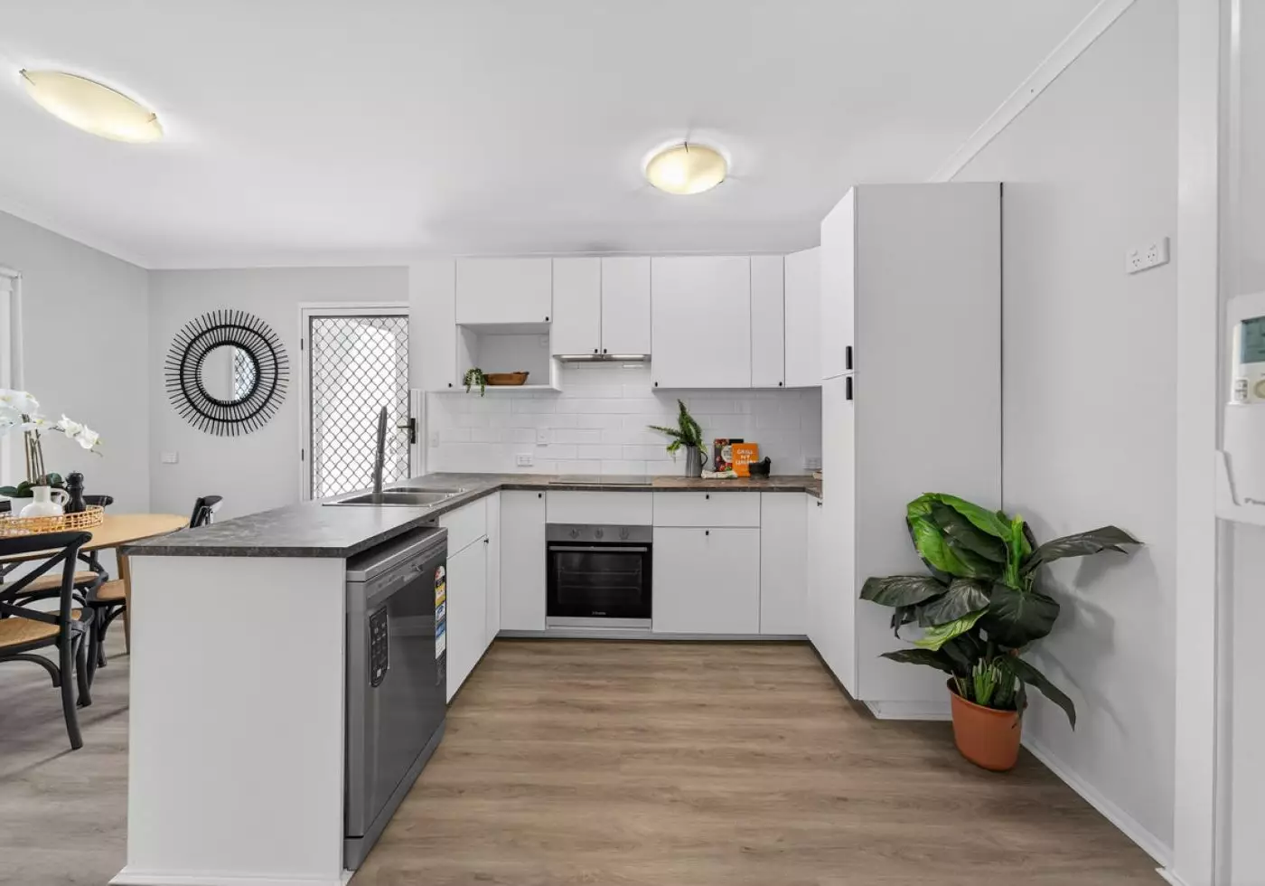 • The open plan kitchen is recently renovated, including premium appliances including a four-burner induction cooktop, electric oven, and dishwasher.