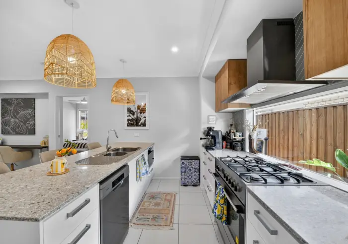 • Modern kitchen featuring 20mm Caesarstone benchtops, high-quality appliances including a 5-burner gas cooktop and rangehood, ample under and overhead cabinetry with soft-close finishes, and a stylish mosaic-tiled splashback.